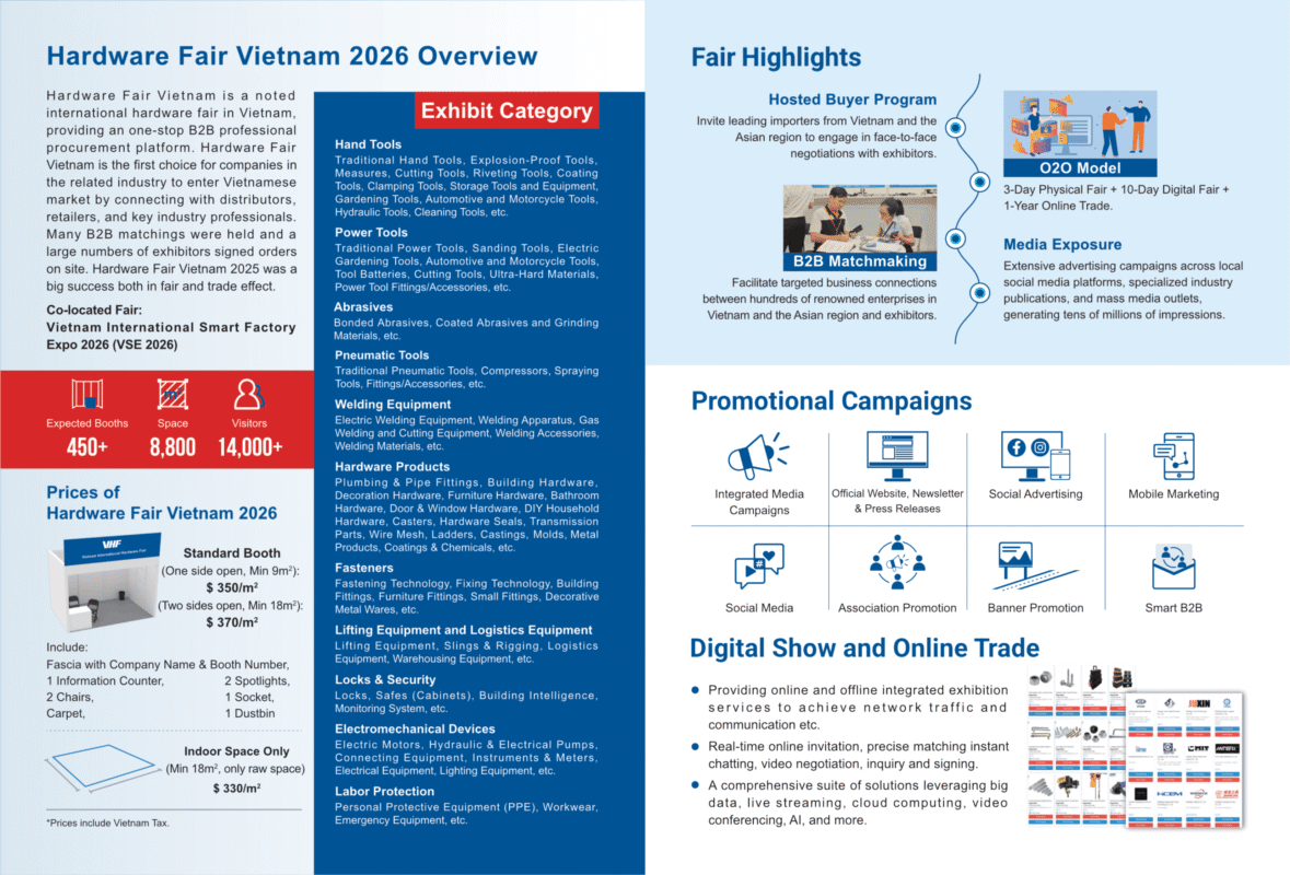 Hardware Fair Vietnam là Triển lãm Quốc tế Sản phẩm Ngũ kim nổi tiếng tại Việt Nam, cung cấp nền tảng mua sắm chuyên nghiệp B2B một cửa.